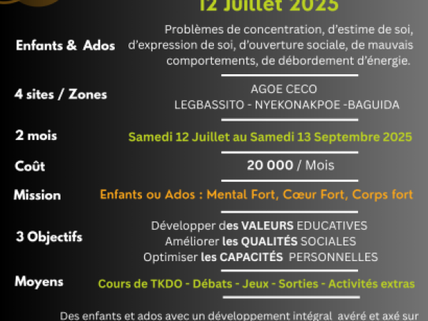 Le programme VACANCES TAEKWONDO EDUCATIF au Togo est un moyen de passer par le Taekwondo pour booster le développement intégral des enfants et ados en misant sur les valeurs morales et les principes de base des arts martiaux en l'occurrence la discipline, le dynamisme, la résilience et l'excellence.